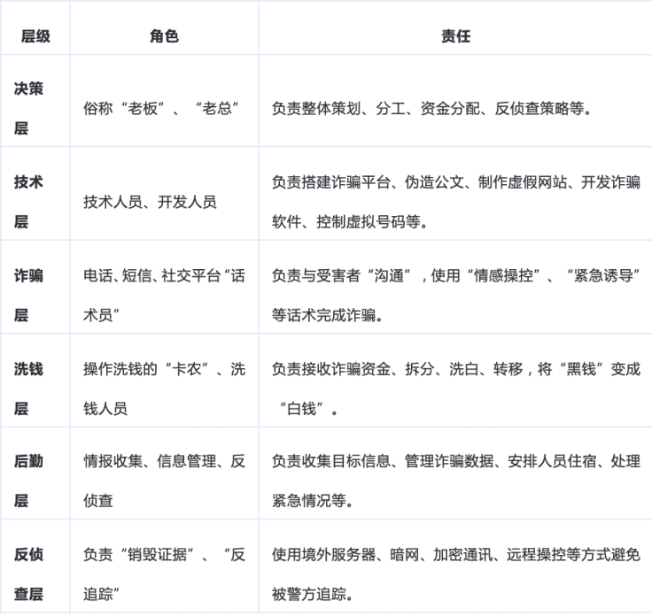 具有十余年反诈工作经验的西城公安分局刑侦支队郝图南警官告诉记者:“电信诈骗犯罪发展到现在,已经不单单是一类突出犯罪,而是形成一个涉诈犯罪生态,是一个多行业支撑、产业化分布、集团化运作、精细化分工、跨境式布局的生态系统。”从“前端诈骗”到“中后端洗钱、分赃、反侦查”,每个环节都有不同的角色和人员负责,都有相应的“黑灰产”供应链,从而形成一个完整的“诈骗产业链条”。