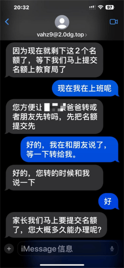 “只剩最后2个名额!”“今天下午截止!”则是骗子在以话术营造紧张感。父母普遍有“再苦不能苦孩子,再穷不能穷教育”的心态,在“时间紧迫”的压力下,家长“冷静核实”的理性让位于焦虑,最终被诱导转账。